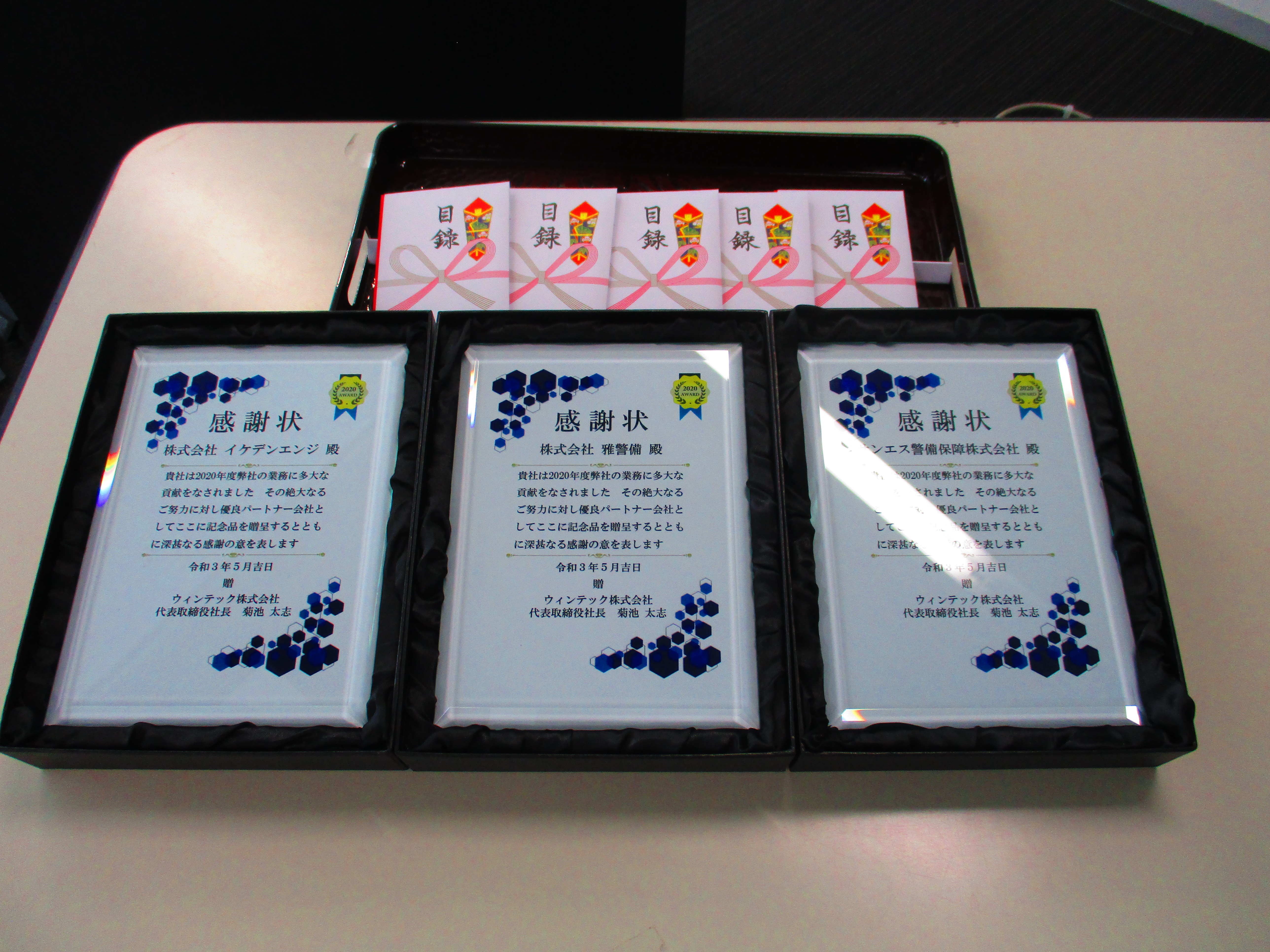 警備部では、安全の確保及び警備隊員の資質向上に貢献して頂いた協力会社様及び協力会社の警備隊員様に対し、2021年5月28日 感謝状の贈呈式を行いました。